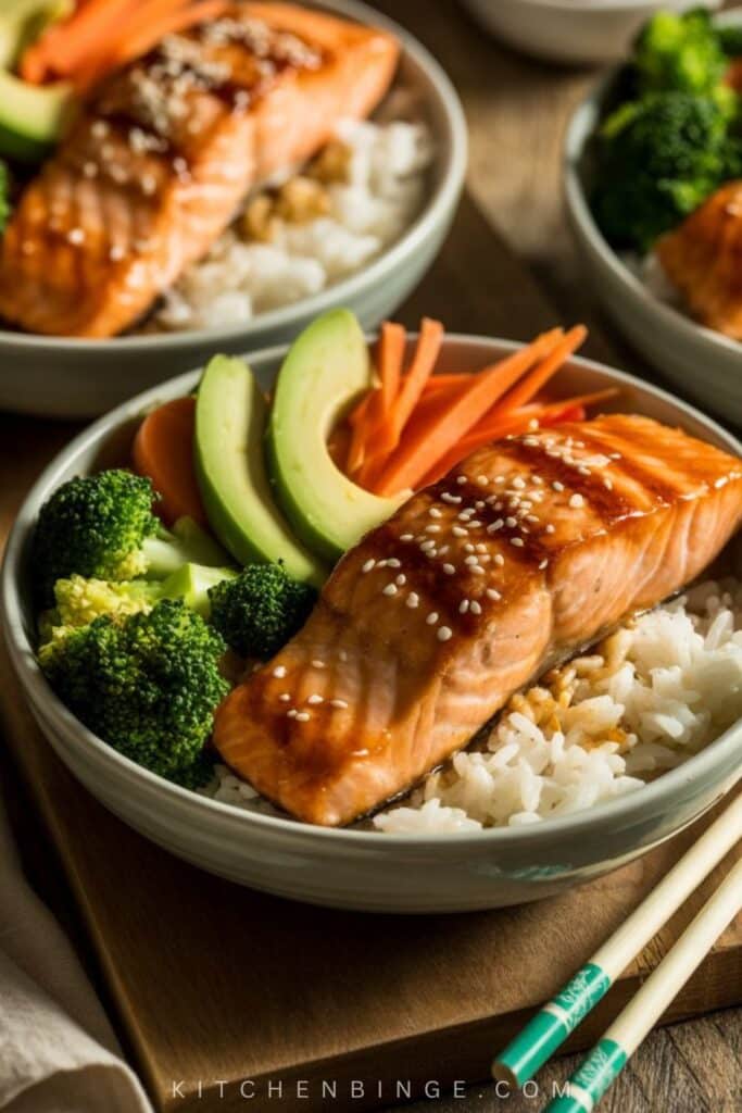 Honey sriracha salmon bowls are a rice-based dish topped with glazed salmon that has been marinated in a sweet and spicy sauce made with honey and sriracha. The salmon is baked or air-fried and served with vegetables such as cucumbers, carrots, or avocado.